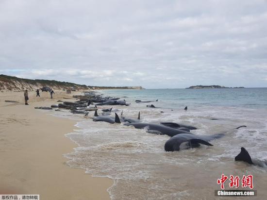 资料图:当地时间2018年3月23日,超过150头领航鲸搁浅在澳大利亚哈梅林湾。救援人员正尝试帮助幸存的鲸鱼重回海中。